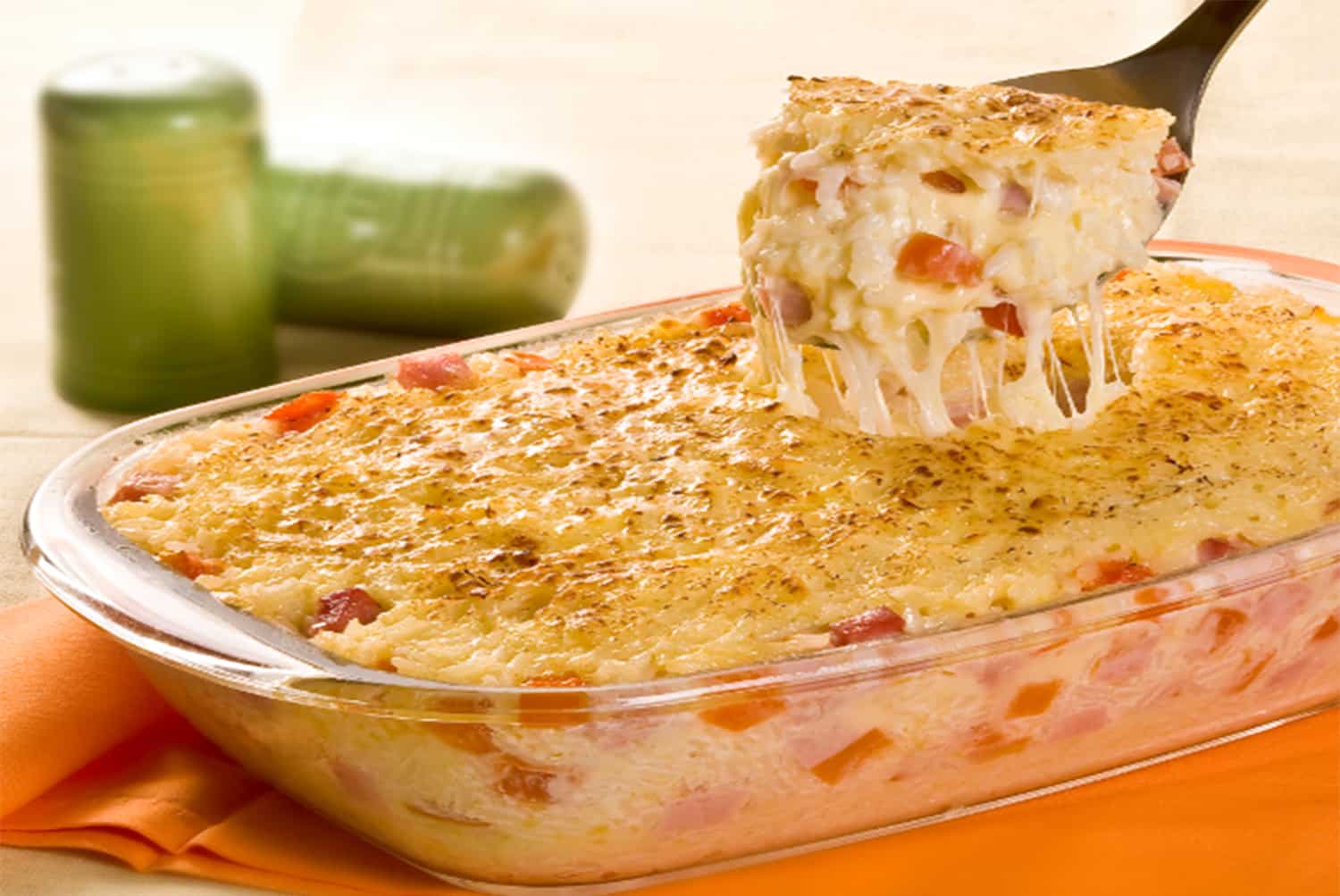 Então, coloque o refogado em uma assadeira, cubra com muçarela e espalhe a batata palha por cima.