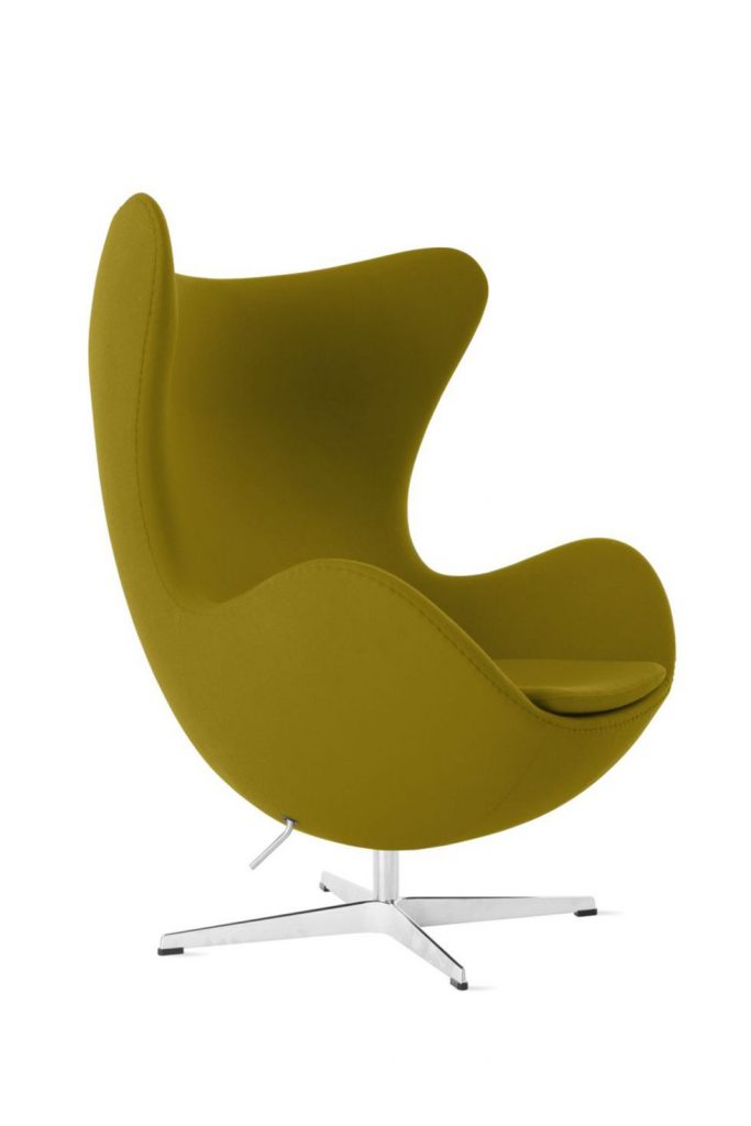 Originalmente projetada por Arne Jacobsen para o SAS Royal Hotel em Copenhagen, a amada cadeira oval fica em uma base giratória e é conhecida por seu encosto redondo liso e design de poltrona com asas.
