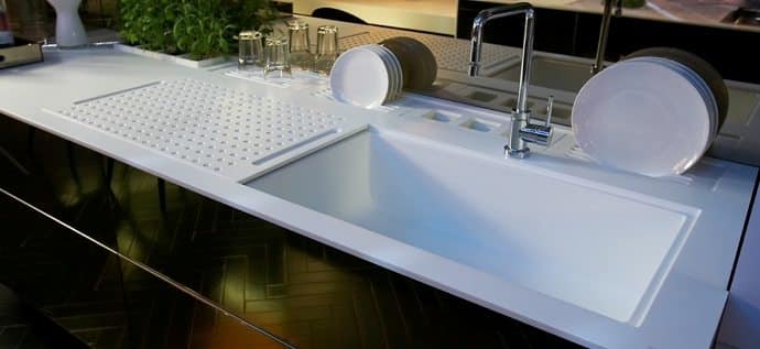 Se você optou pelo Corian, saiba que a mais nova moda nas cozinha são os acessórios de pia, e o Corian oferece essa possibilidade com grande estilo.