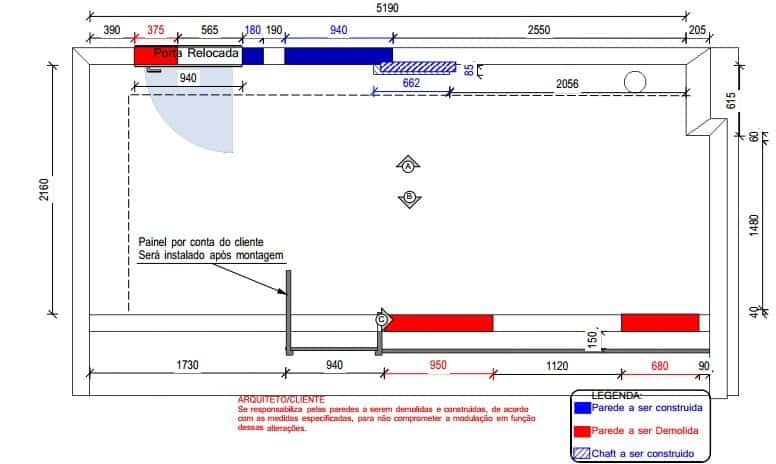Veja no projeto executivo da empresa de moveis planejados o local da demolição em vermelho: