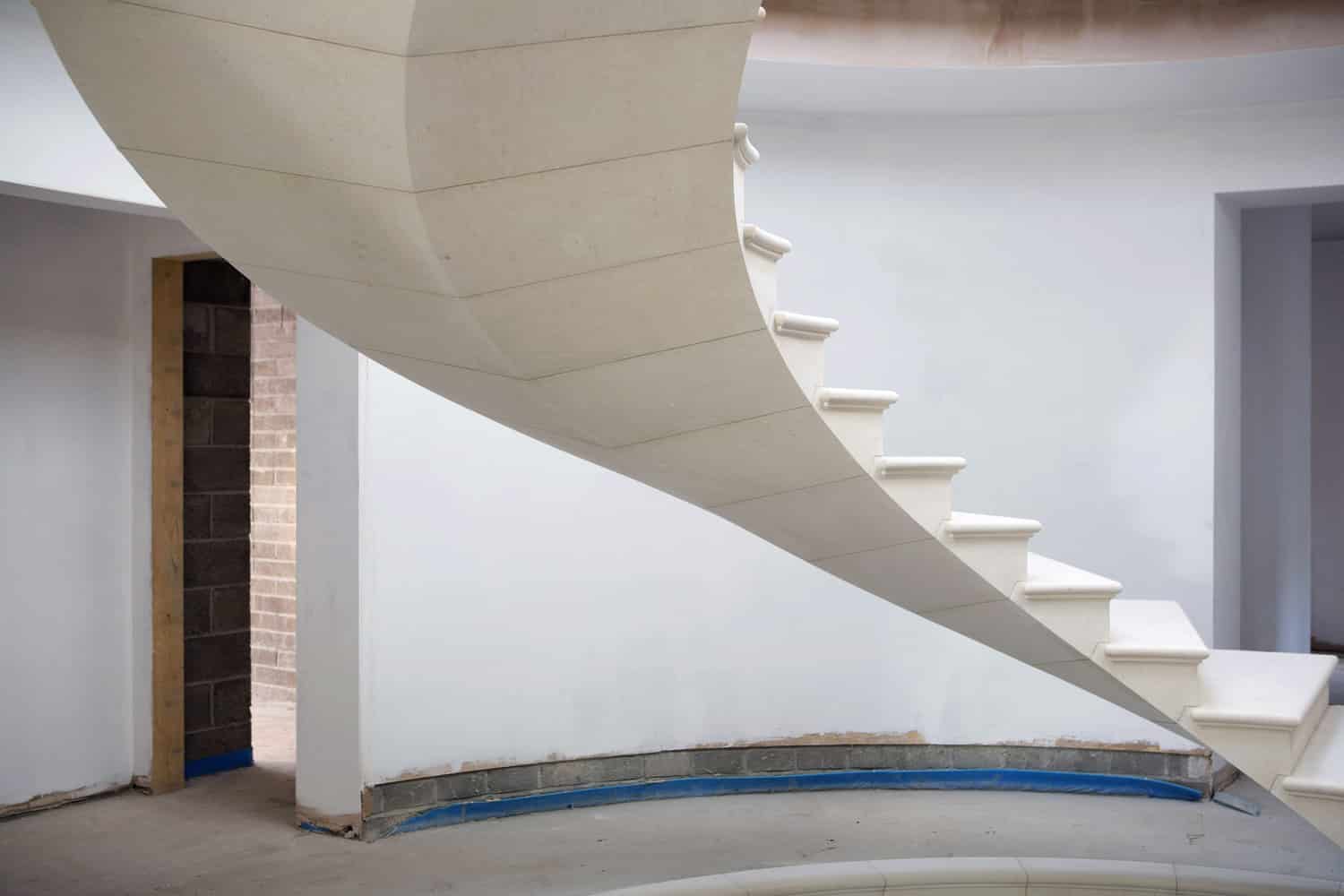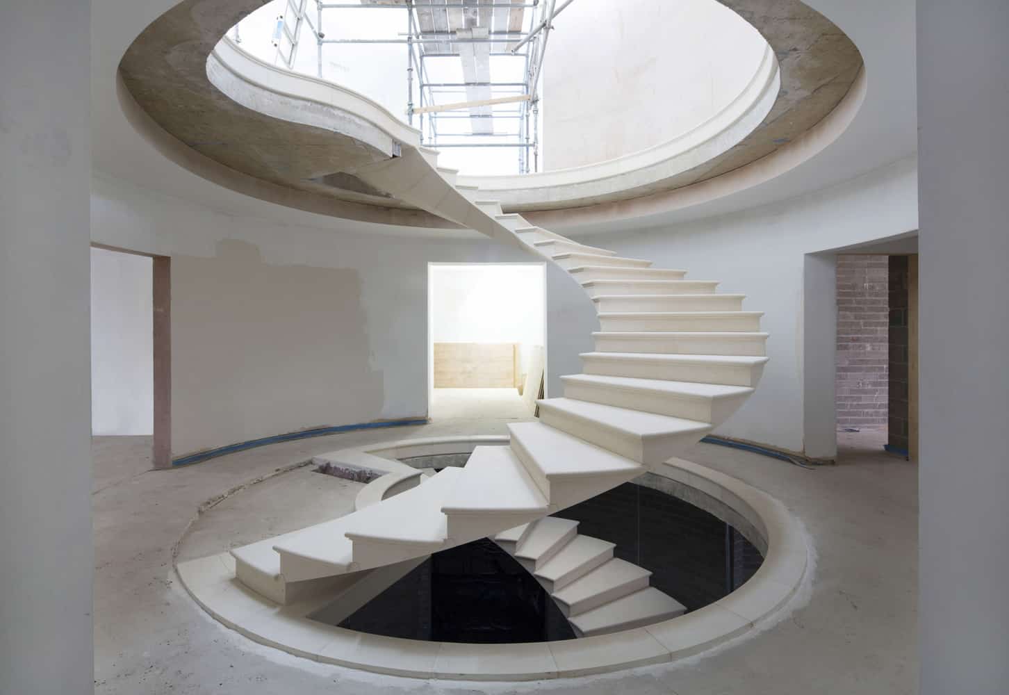 As escadas helicoidais já são ousadas por si só, mas a escada projetada pela Webb Yates Engineers e pela The Stonemasonry Company supera no quesito ousadia (mais ousada que as escadas móveis de Harry Potter). A escada foi projetada para um projeto do RAL Architects em Formby, no Reino Unido.