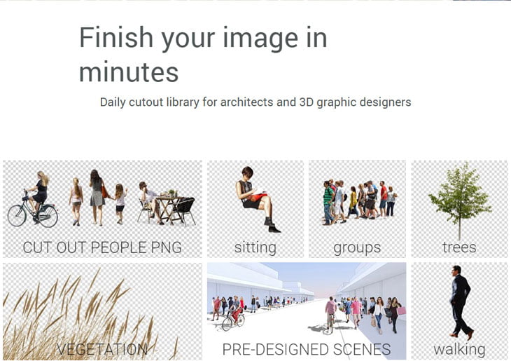 Não é fácil achar organizadamente e em apenas um local, pessoas 2D recortadas em png, modelos e textura 3D para suas renderizações.
